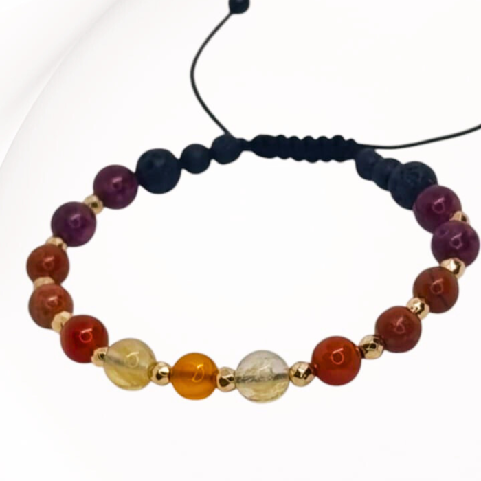 Creata pentru a sustine curajul, increderea si energia, aceasta bratara insoteste spiritul activ si plin de initiativa al Berbecului, in ritmul sau natural, zi de zi. Lucrata manual cu piatra de lava si cristale de carneol, citrin, jasp rosu, hematit si granat, este o bijuterie eleganta si delicata, cu rol de difuzor pasiv, care te ajuta sa te bucuri de energia pozitiva a cristalelor si de beneficiile uleiurilor esentiale preferate, oriunde ai fi.