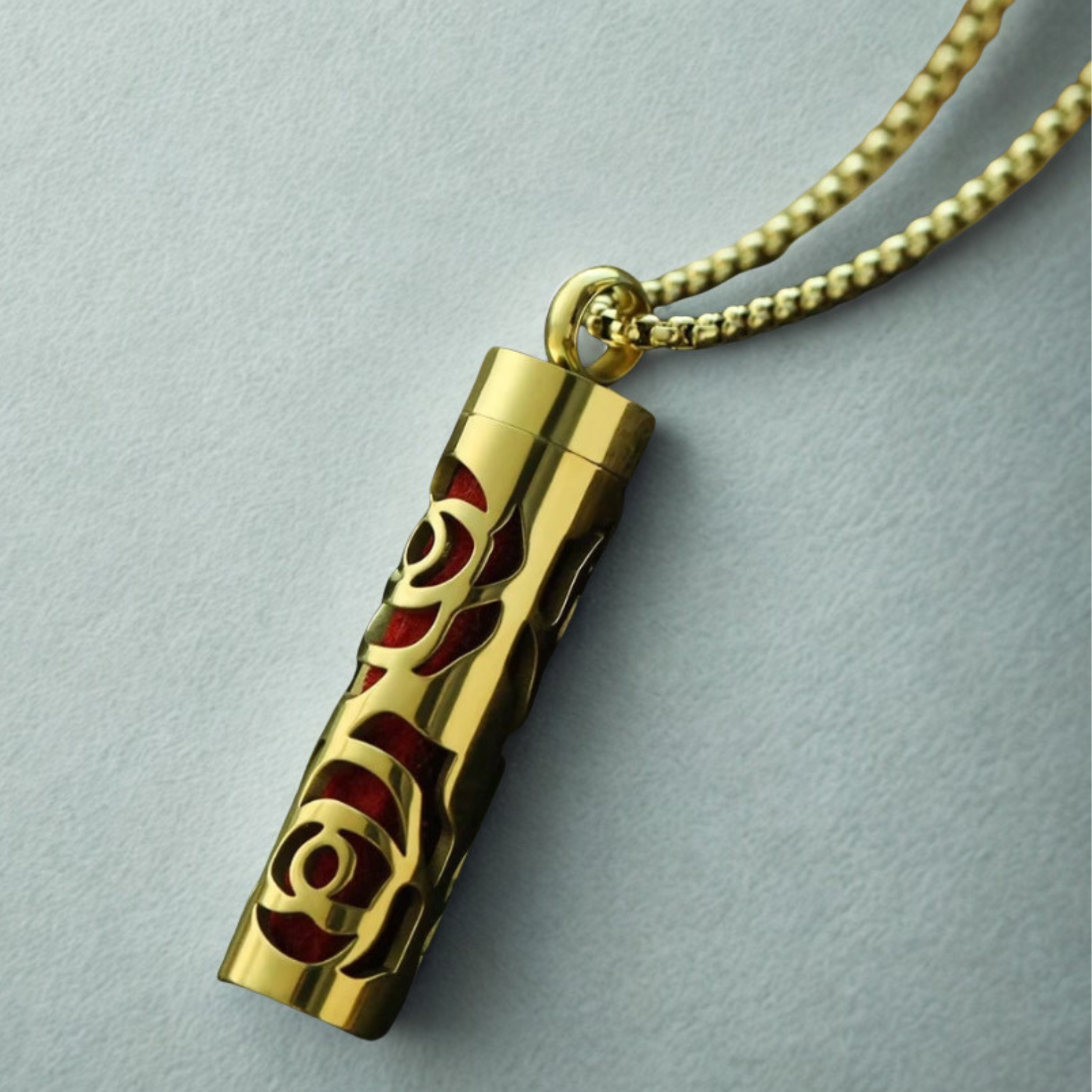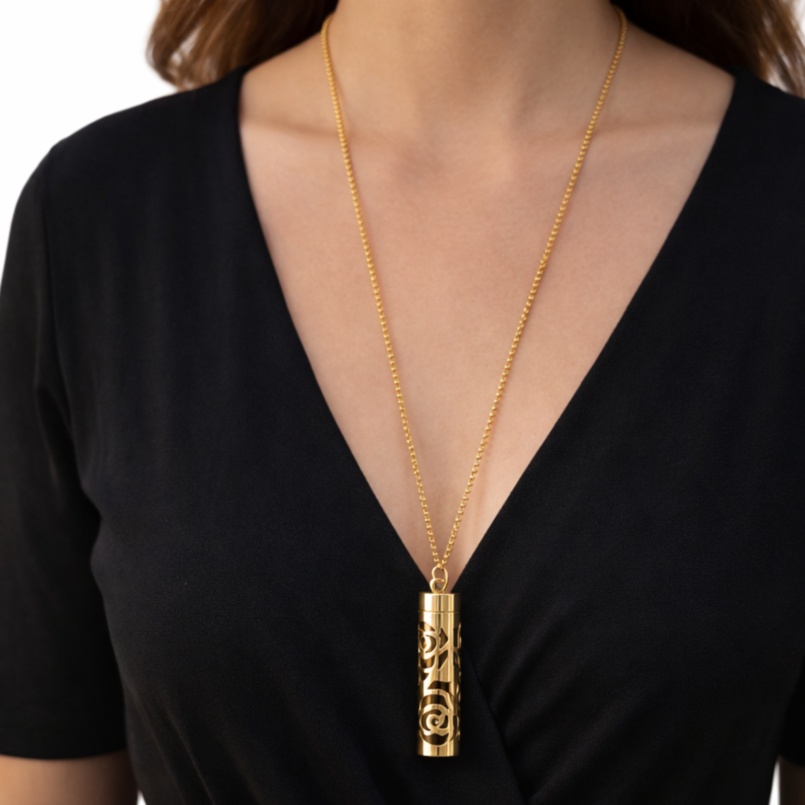 Pandantivul are forma unui cilindru delicat, decorat cu un model cu trandafiri decupati, iar in interior ascunde o banda din fetru colorat, pe care aplici cateva picaturi din uleiul tau preferat. Aroma se difuzeaza treptat, oferindu-ti o stare placuta de relaxare si echilibru pe tot parcursul zilei.