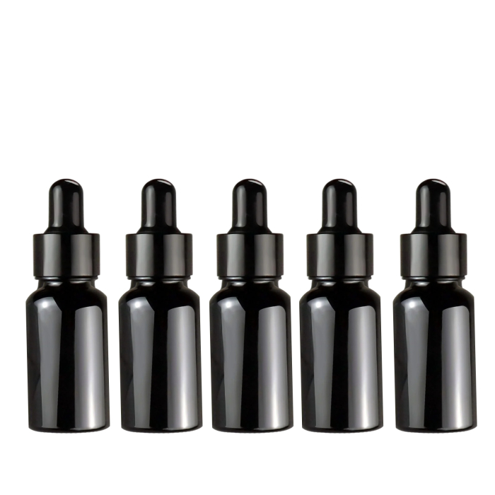 Set 5 recipiente din sticla groasa, neagra, lucioasa, cu pipeta, 10 ml. Ideale pentru dilutii de uleiuri esentiale, seruri cosmetice si amestecuri lichide. Protejeaza continutul de lumina, asigura inchidere etansa si permite aplicare controlata, picatura cu picatura. Elegante, practice si reutilizabile.