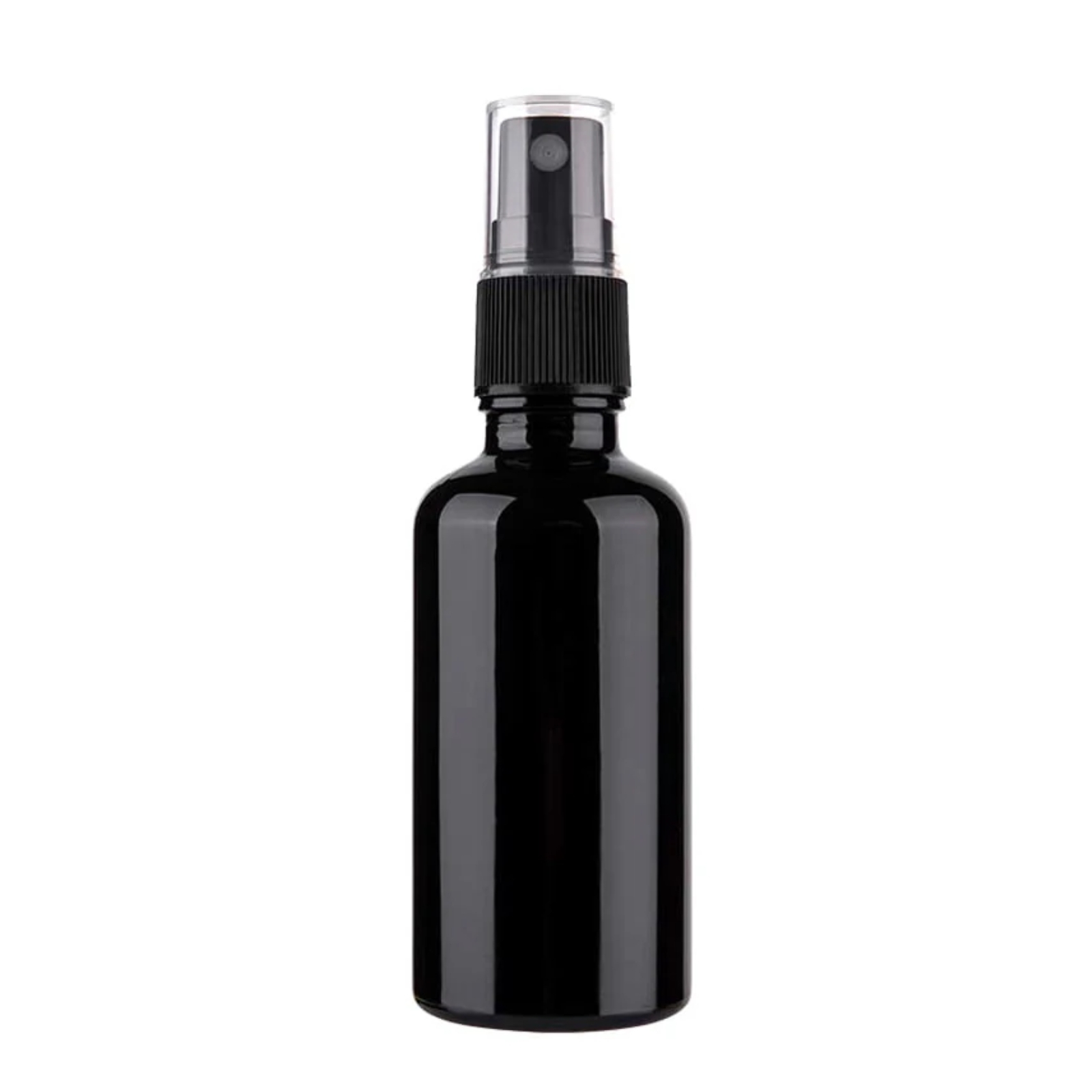 Recipient cu spray din sticla groasa, neagra si lucioasa, capacitate 30 ml. Ideal pentru parfumuri, spray-uri de camera DIY sau amestecuri cu uleiuri esentiale. Protejeaza continutul de lumina si asigura pulverizare fina si uniforma.