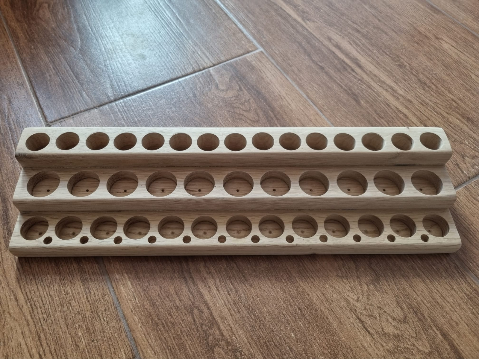 Acest suport complex, realizat manual din lemn de stejar, te ajuta sa iti organizezi sticlutele esentiale de diferite dimensiuni. De asemenea, iti protejeaza mobila sensibila de actiunea uleiurilor mai puternice care pot afecta culoarea suprafetelor cu care intra in contact. Este conceput pentru 33 de sticlute dispuse pe 3 niveluri: 11 x 15 ml, 11 x 5/10 ml, 11 recipiente roll-on. Numit si copacul rege, stejarul este una dintre cele mai apreciate si frumoase esente de lemn, iar suportul, cu aspectul sau nobil, va arata bine oriunde vei alege sa il expui. Noua ne place lemnul natur, iar suprafata suportului este atat de fina incat am ales sa nu il finisam cu lac. Daca doresti ca suportul sa fie lacuit cu lac incolor pe baza de apa, te rugam sa mentionezi acest aspect in rubrica Observatii, atunci cand plasezi comanda. Pretul suportului va fi acelasi, iar timpul de livrare va creste cu o zi lucratoare. Intrucat este realizat manual din lemn natural, fiecare produs are caracterul sau unic. Dimensiuni: Lungime: 42 cm; Latime: 13 cm; Inaltime: 5.7 cm; Diametrul orificiilor: 2.2 cm, 2.5 cm respectiv 3 cm.