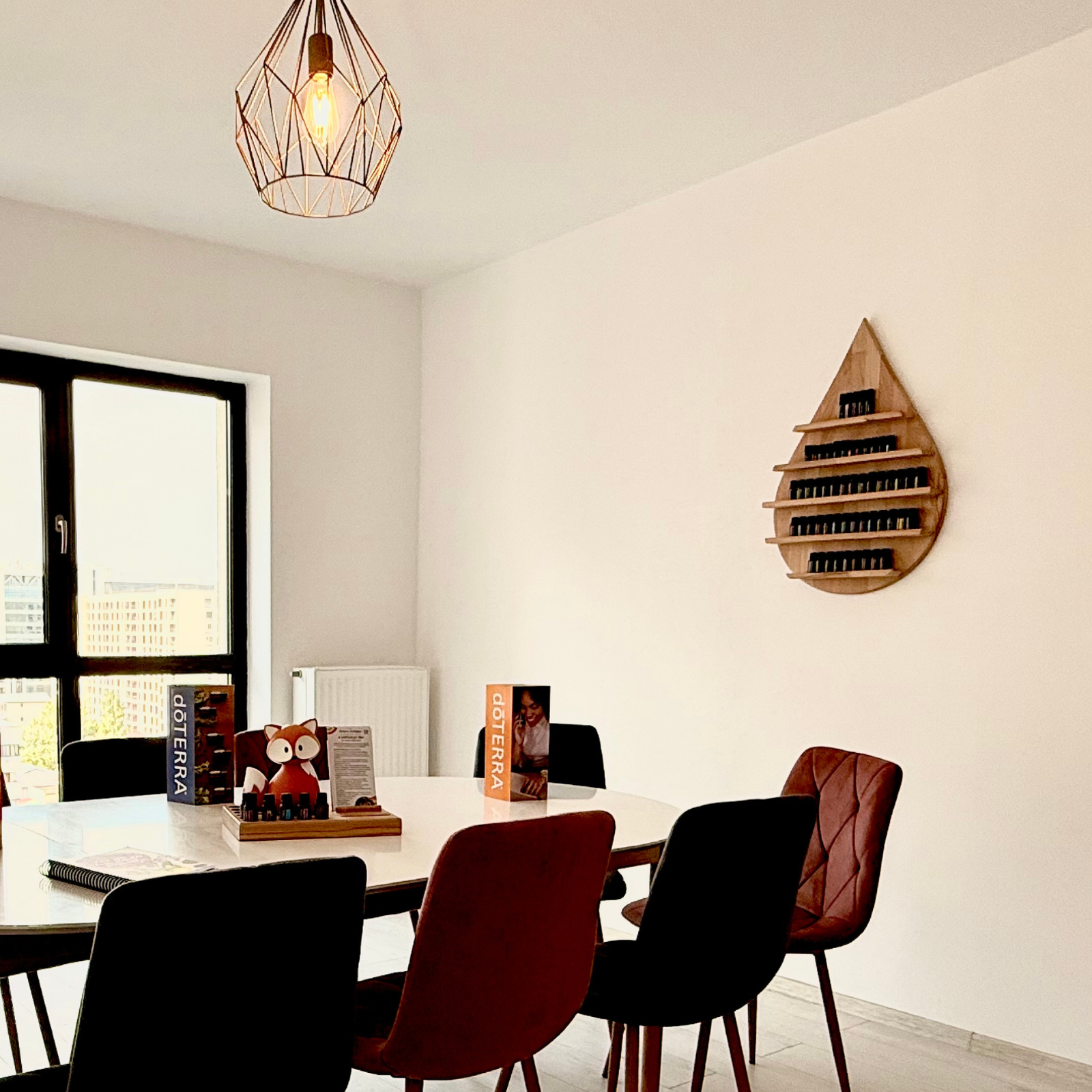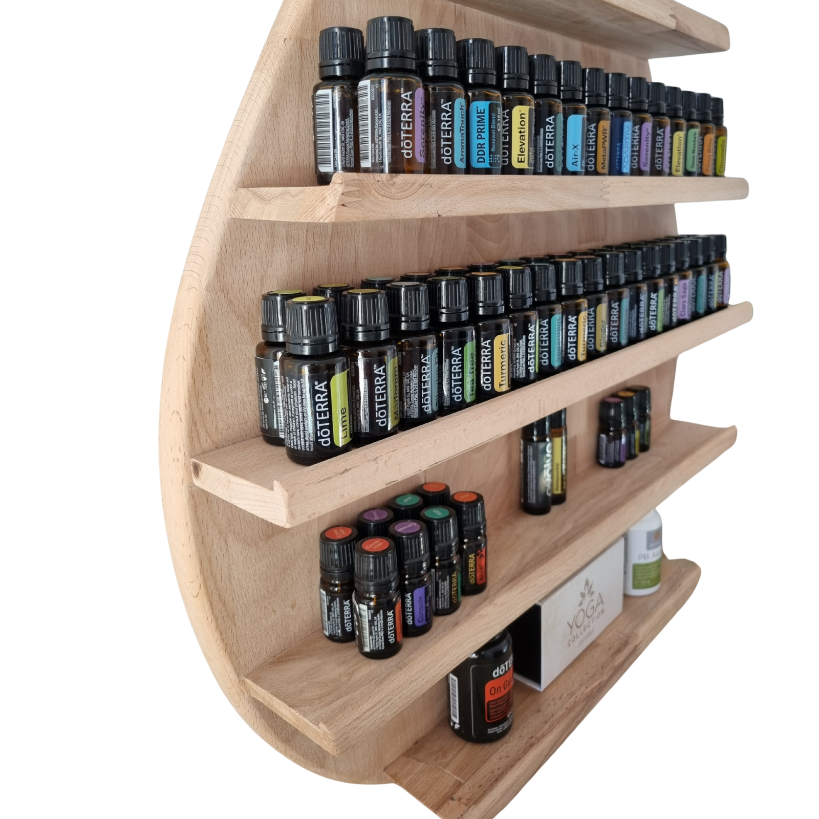Suport de perete în formă de picătură, realizat manual din lemn de fag, creat pentru depozitarea uleiurilor esențiale și a produselor doTERRA într-un mod elegant și ordonat.