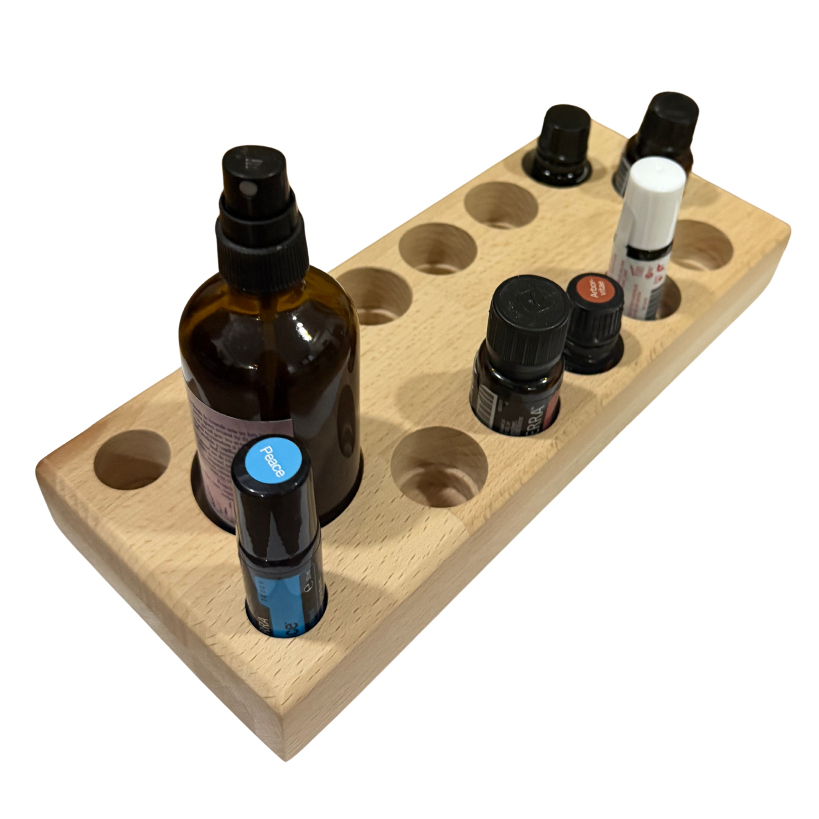 Acest suport realizat manual din lemn de fag te ajuta sa iti organizezi uleiurile esentiale si sa le ai mereu la indemana.