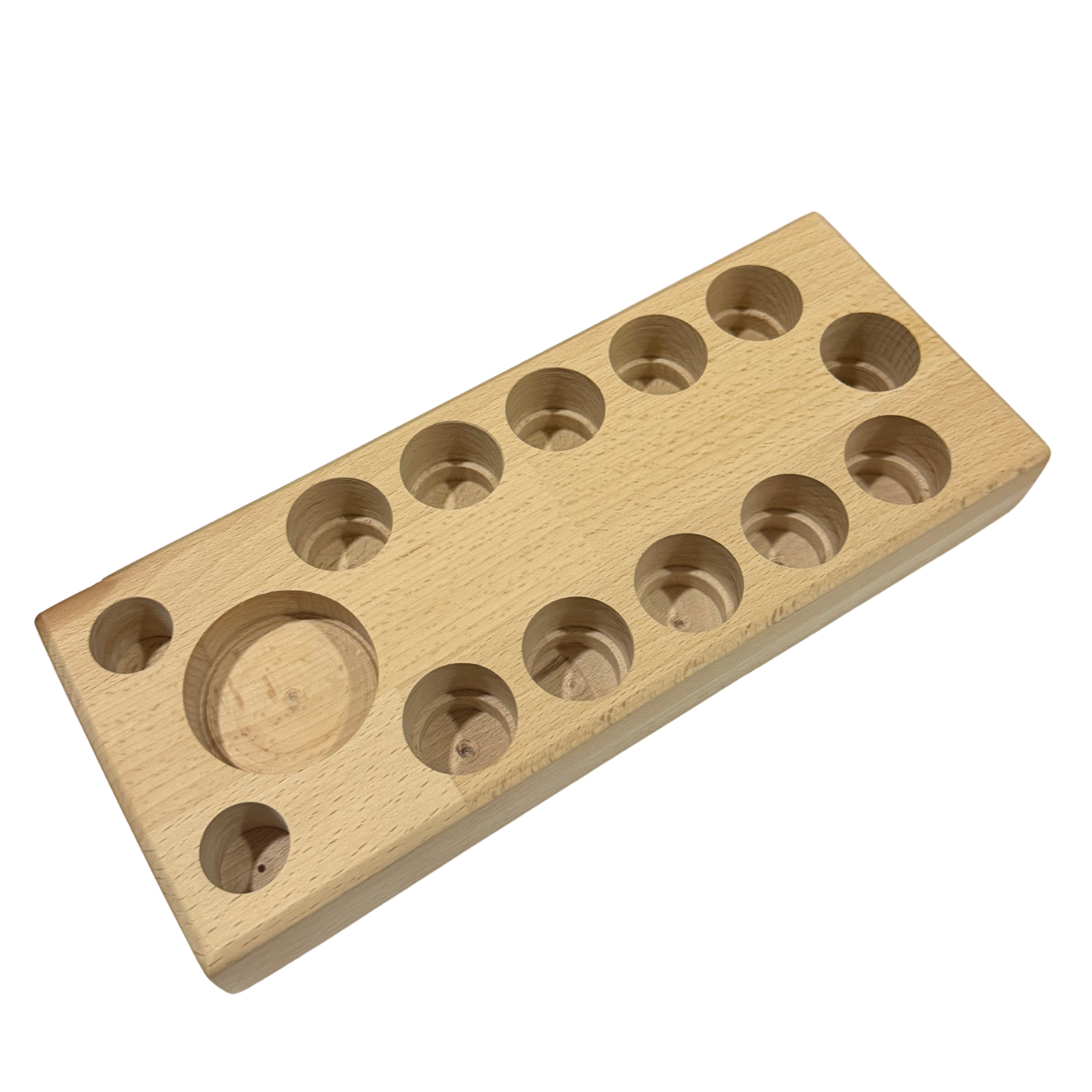 ✔️ 12 orificii duble (potrivite pentru sticlute de 5 si 15 ml, precum si Touch-uri) care iti permit sa aranjezi uleiurile exact in ordinea indicata de protocolul utilizat
